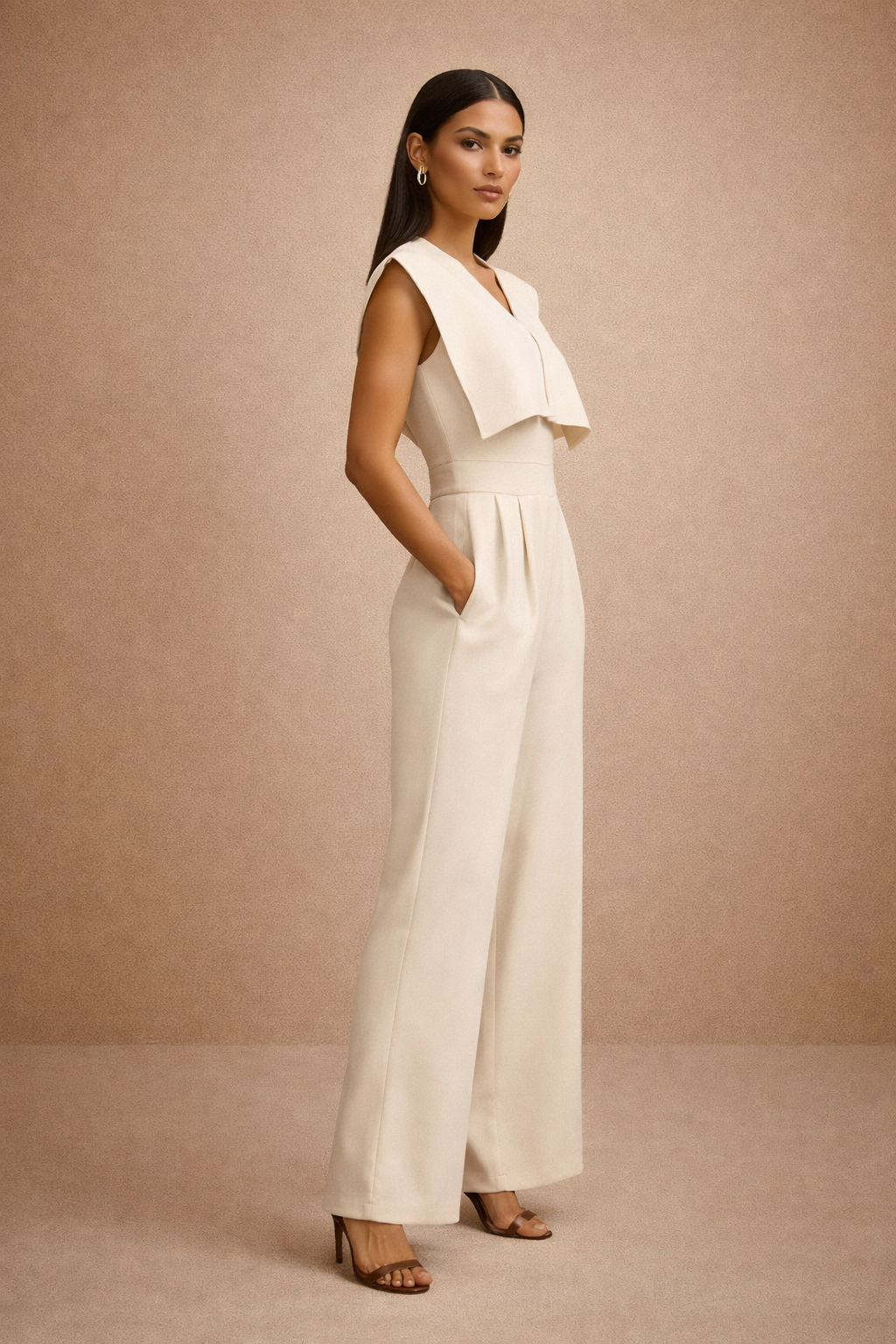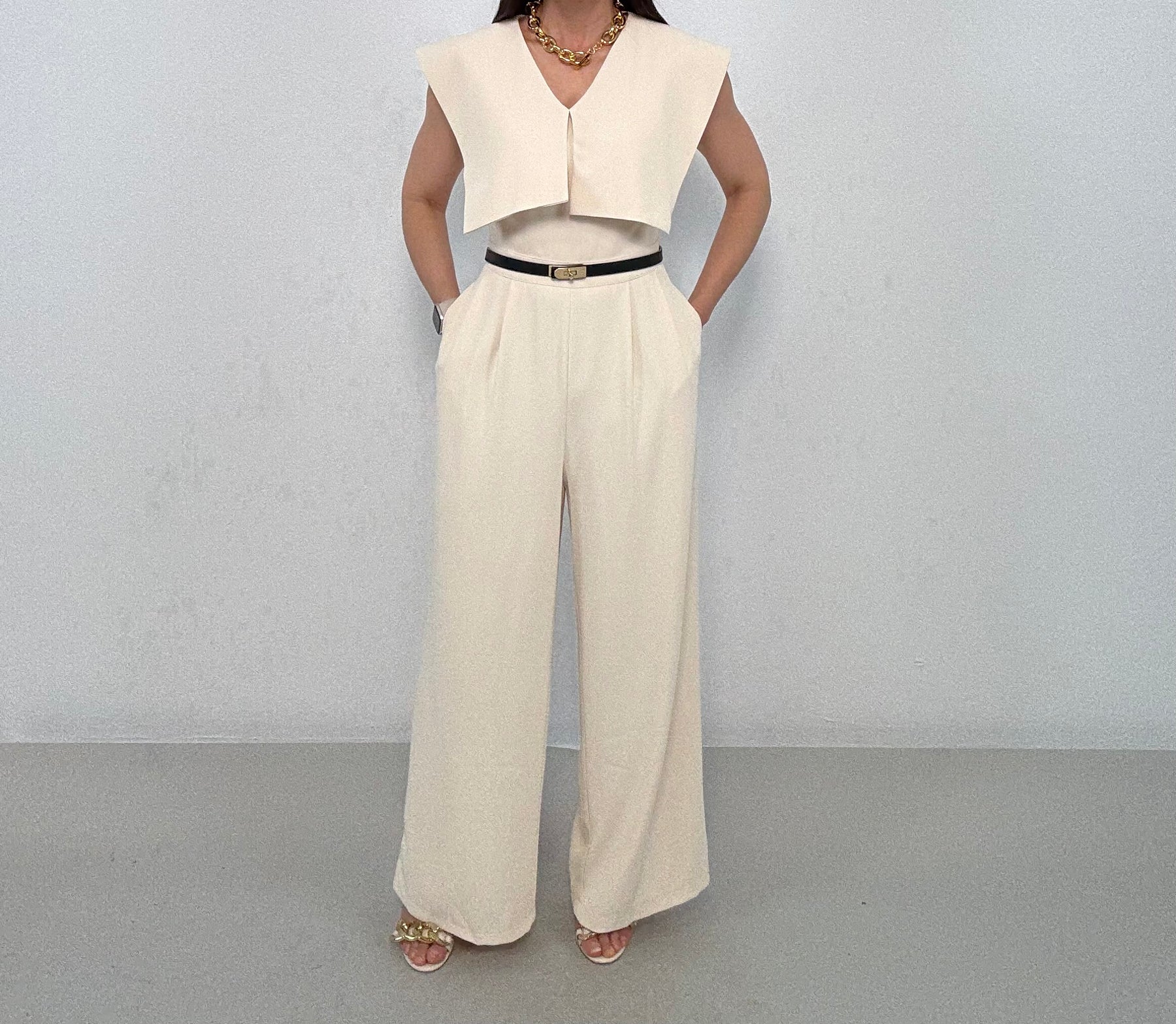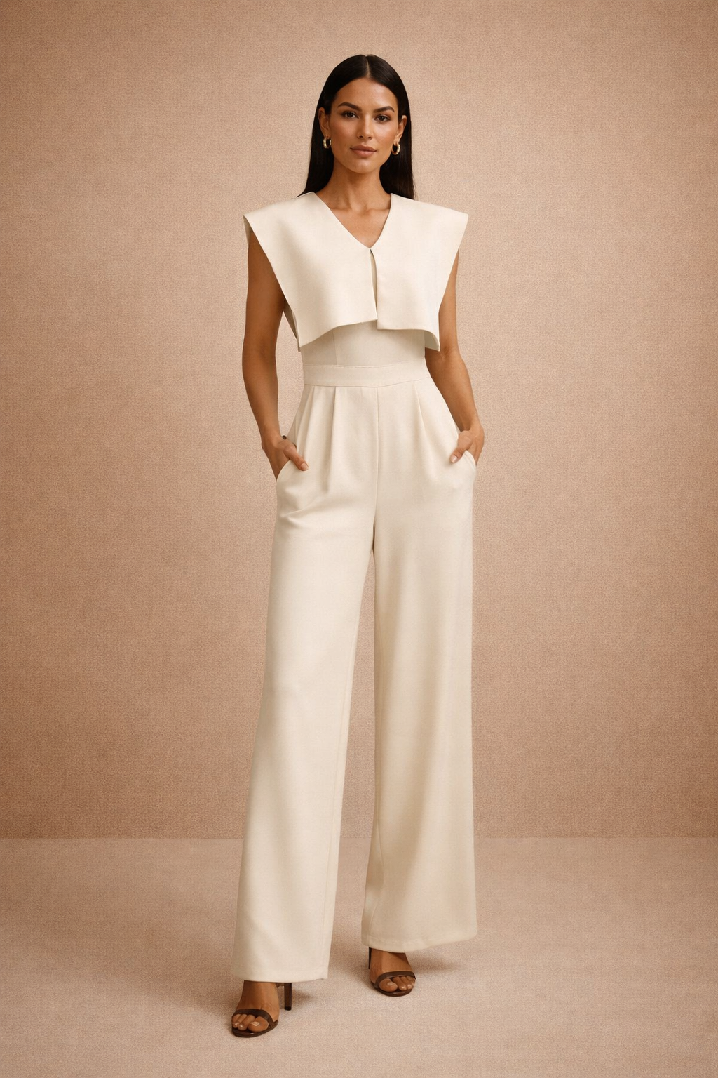 Make a statement in this elegant cream jumpsuit featuring a structured cape-style overlay that drapes over the shoulders for a sophisticated, fashion-forward look. The sleeveless design and flattering V-neckline balance the bold top detail, while the tailored waist flows into wide-leg pants that elongate the silhouette. Side pockets add functionality without compromising style.