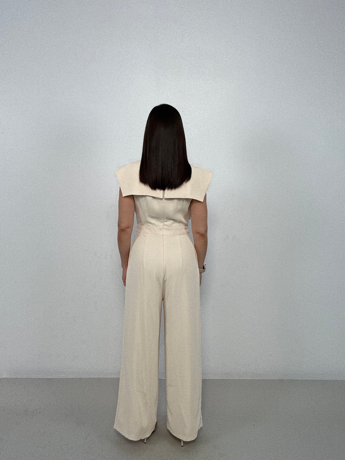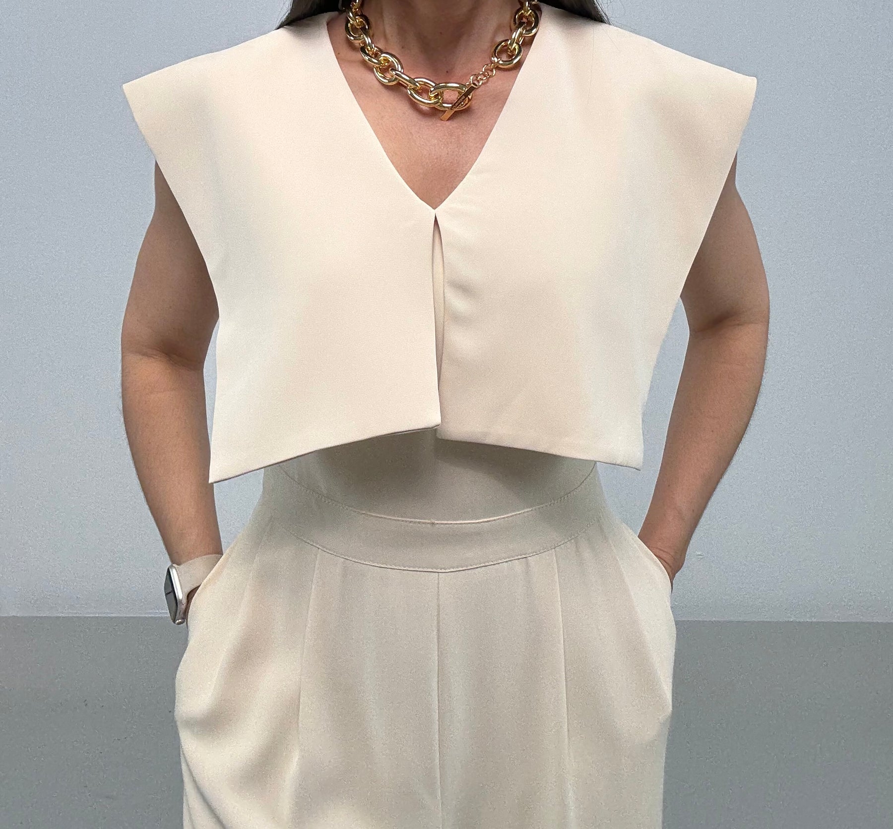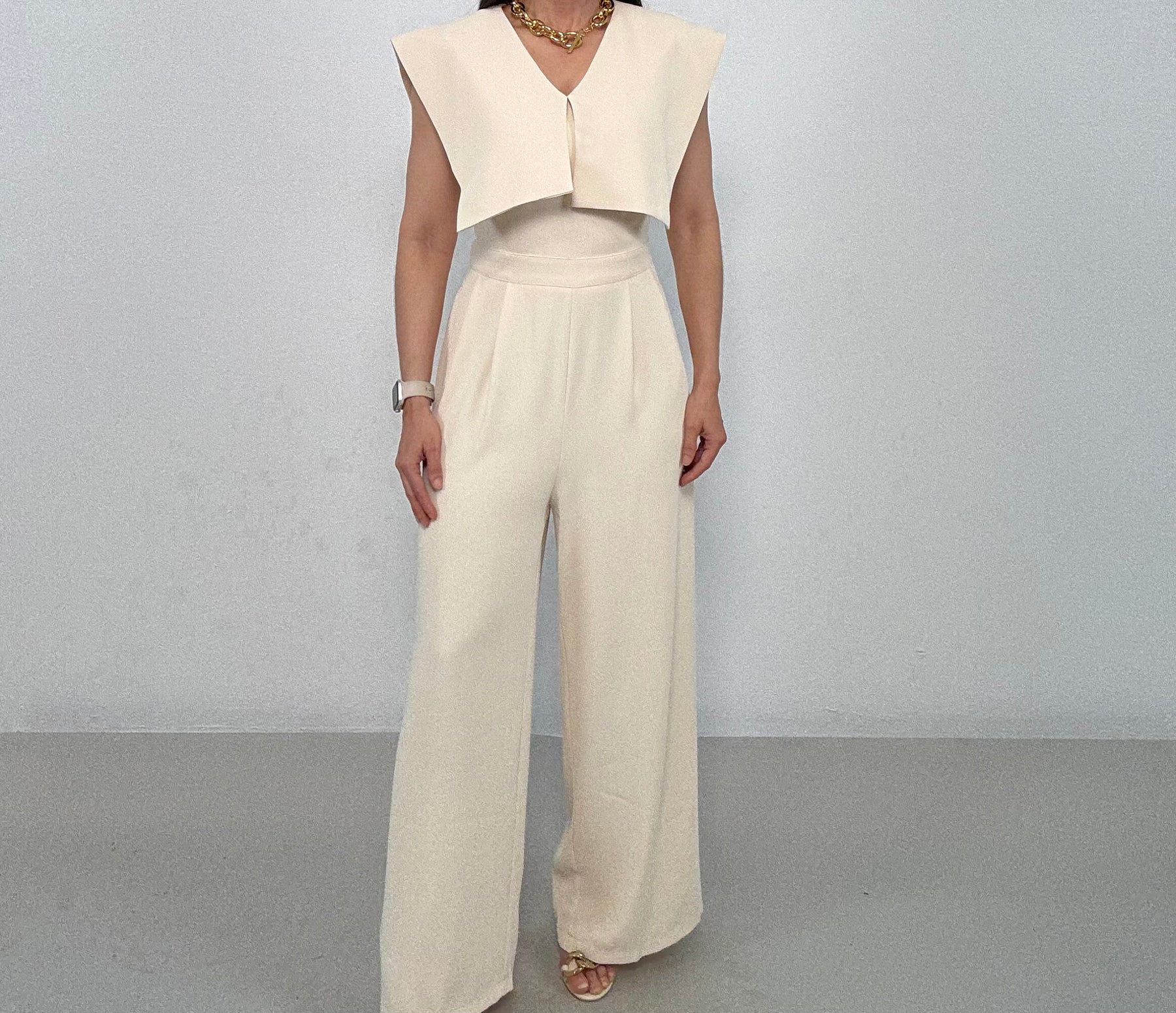 Make a statement in this elegant cream jumpsuit featuring a structured cape-style overlay that drapes over the shoulders for a sophisticated, fashion-forward look. The sleeveless design and flattering V-neckline balance the bold top detail, while the tailored waist flows into wide-leg pants that elongate the silhouette. Side pockets add functionality without compromising style.